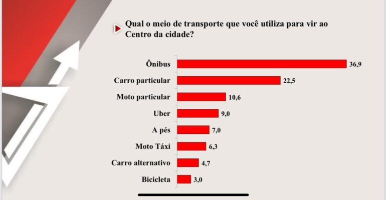 Os pesquisadores foram as ruas e fizeram o seguinte questionamento: Qual meio e transporte você utiliza para vir ao Centro da cidade?