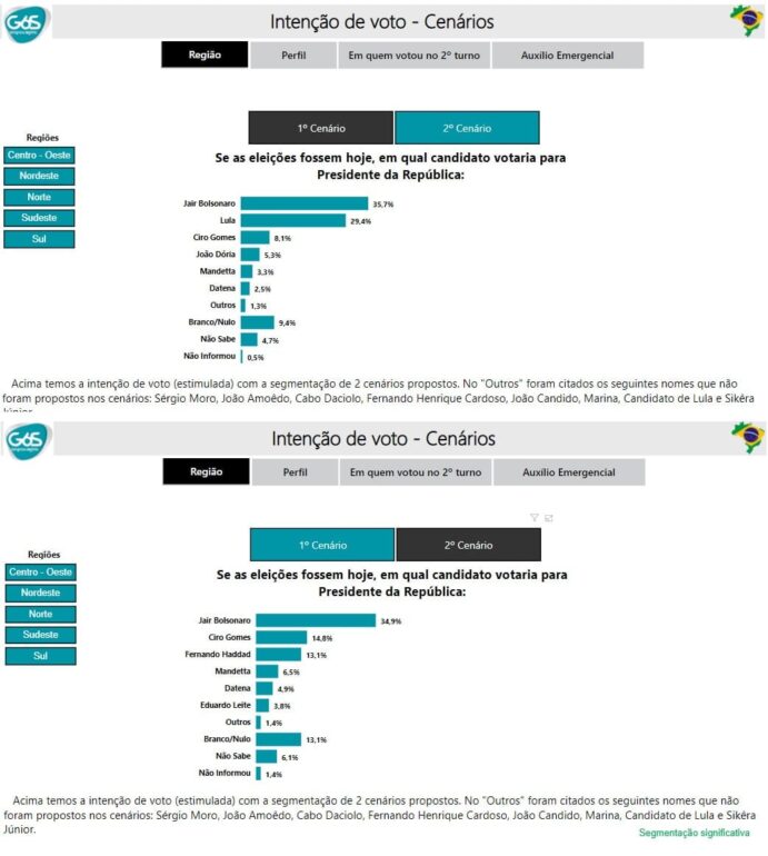 Ciro Gomes(PDT) vem em seguida com 8,1%, João Dória 5,3%, Mandeta 3,3%, Datena com 2,5%, outros 1,3%, votos brancos e nulos 9,4%, não sabe 4,7%, não informou 0,5%.