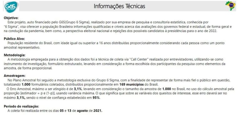 Foram utilizados mil formulários, distribuídos proporcionalmente em 169 municípios do Brasil. Nível de confiança da pesquisa é de 95%, e a coleta foi realizada entre os dias 5 e 13 de agosto.