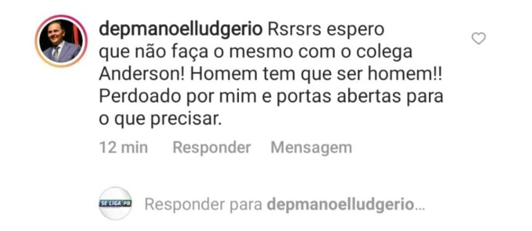 Mas troca de Manoel por Anderson parece que não saíra muito barata para Lulu. Isso porque ao contrário de Adriano Galdino – que após ter sido esquecido, permaneceu em silêncio – Ludgério, colocou os dedinhos nervosos para funcionar e o próprio, chegou a disparar um veneno em uma rede social, comentando o perfil espumoso de Lulu.
