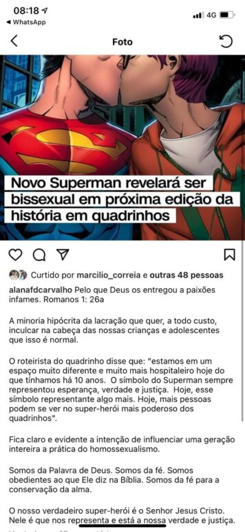 Assim como o jogador de vôlei Maurício Souza – que foi afastado do Minas Tênis Clube após ser acusado de homofobia, a coordenadora da Agência Municipal de Desenvolvimento de Campina Grande, Alana Carvalho, resolveu retirar do ar uma postagem com tom preconceituoso e homofóbico feita por ela nas redes sociais ao comentar o anúncio da criação de uma história em quadrinhos onde o personagem americano SuperMan assume sua bissexualidade.