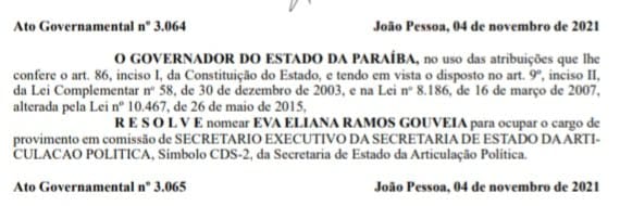 O governador João Azevêdo nomeou a vereadora Eva Gouveia como a nova secretária-executiva de Articulação Politica, com a função de chefiar o novo Escritório de Representação que voltará a funcionar em Campina Grande.