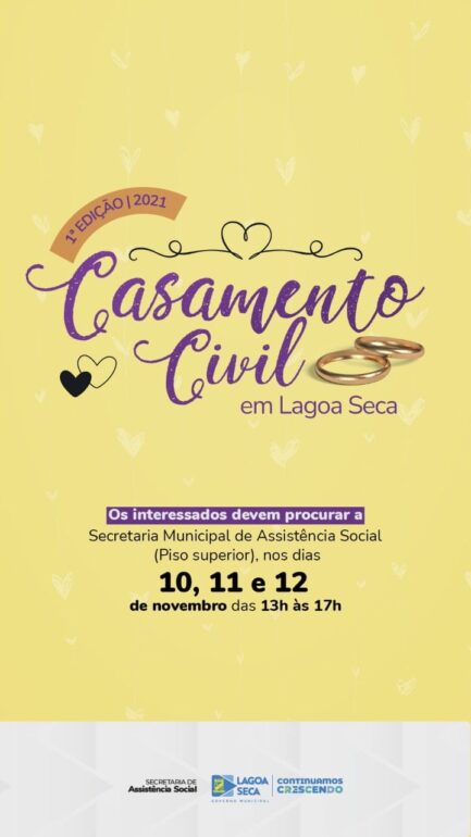 Esta será a primeira vez em que a cidade de Lagoa Seca vai realizar um casamento civil coletivo. O evento está sendo organizado pelo governo municipal, por meio da Secretaria de Assistência Social.