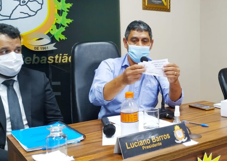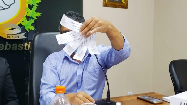 Na mesa foram disponibilizadas 9 cédulas de votação, e cada vereador foi chamado para pegar a cédula, votar e colocar na urna, restando quatro cédulas dos vereadores ausentes.