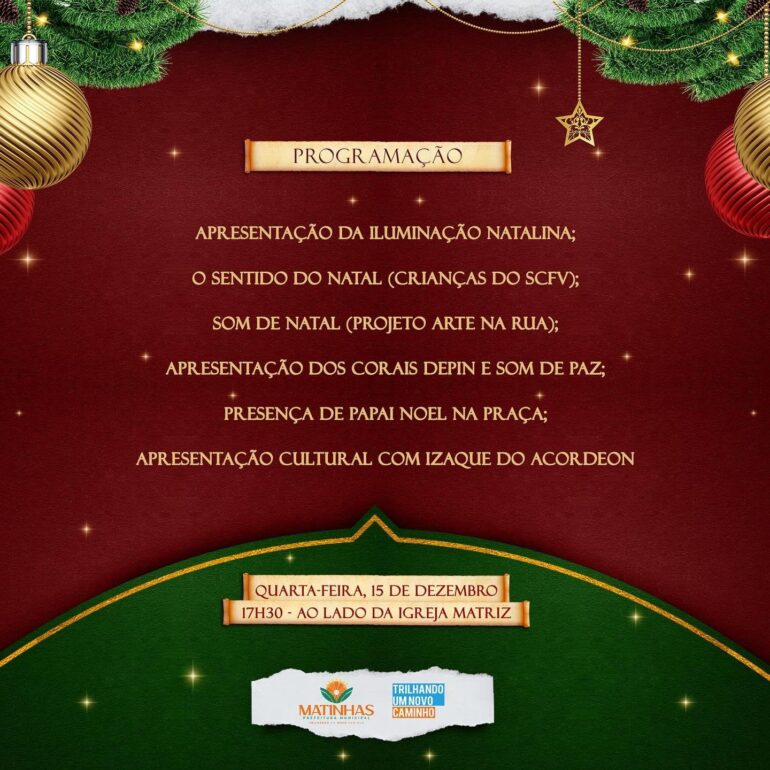 A prefeitura de Matinhas, por meio do Departamento de Cultura e Turismo, apresenta agenda cultural do “Natal de um Novo Tempo”, que será realizado na próxima quarta-feira (15).