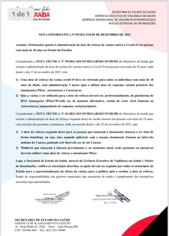 A Secretaria de Saúde da Paraíba emitiu uma nota técnica orientando a população sobre a aplicação de dose de reforço da vacina contra covid-19. De acordo com a nota, a dose de reforço deverá ser aplicada após cinco meses da imunização da última dose de esquema vacinal primário dos imunizantes da Pfizer, Astrazeneca e Coronavac.