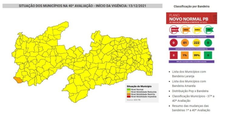 A Paraíba continua com apenas o município de Santa Inês na bandeira laranja e os outros 222 municípios na bandeira amarela, como ficou constatado desde 13 de novembro, na 38ª avaliação. É o que mostra a 40ª avaliação do Plano Novo Normal PB, divulgada neste sábado (11).