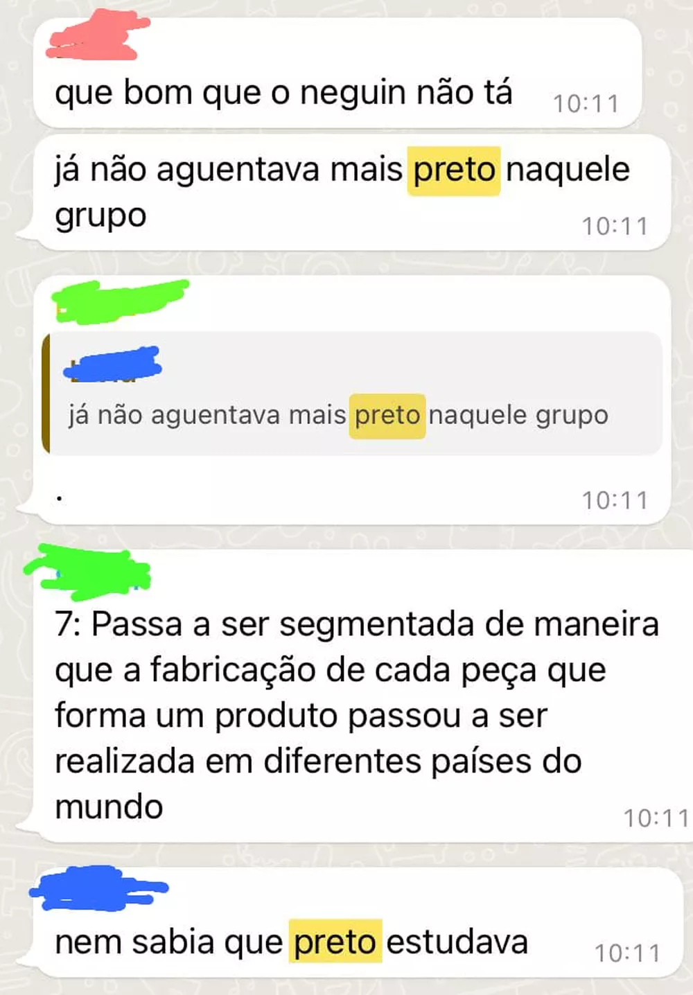 “Saudades de quando preto era escravo” foi uma das frases ditas pelos jovens em um grupo de WhatsApp, criado para debater as provas on-line do colégio.