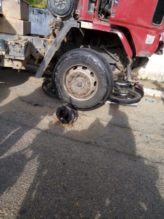 O homem pilotava uma motocicleta, acompanhado de uma mulher, quando foram atingidos por um caminhão sem freio.