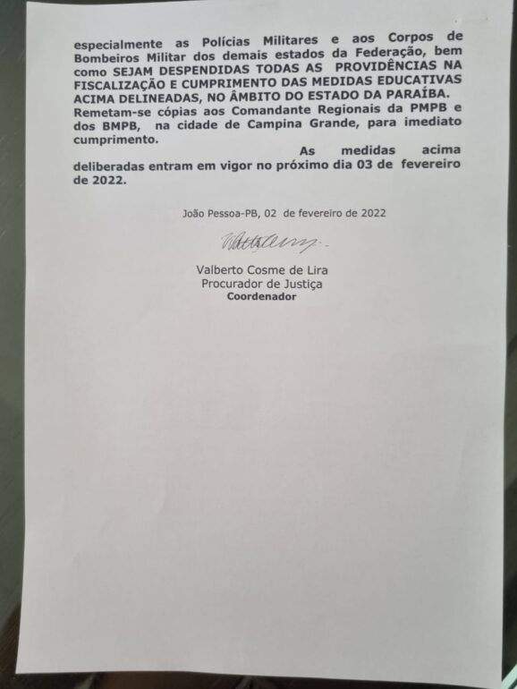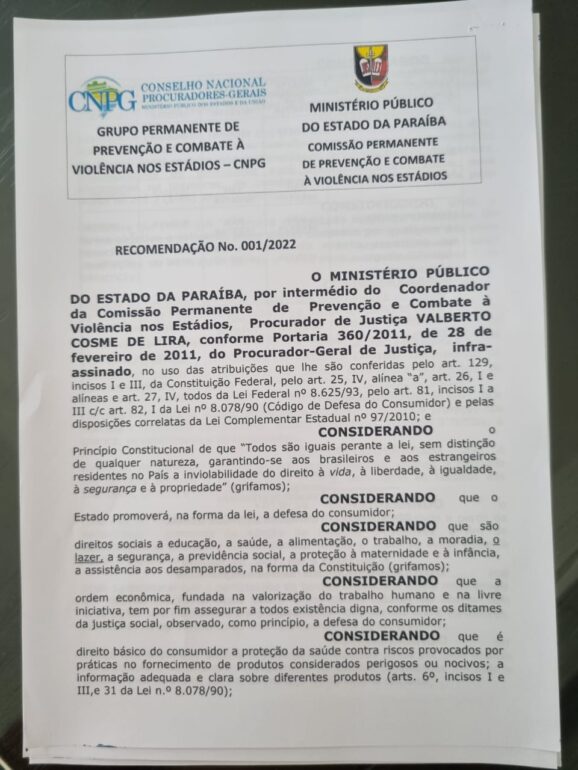 O documento foi assinado por Valberto Lira, que é procurador de Justiça e também coordenador da Comissão Permanente de Prevenção e Combate à Violência nos Estádios.