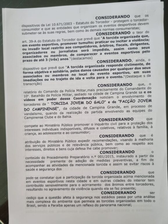 O Ministério Público da Paraíba (MPPB) resolveu recomendar o afastamento da Torcida Jovem do Galo (TJG), do Treze, e da Torcida Facção Jovem (TFJ), do Campinense dos estádios. A proibição tem duração de 1 ano e valerá para todo o território nacional.
