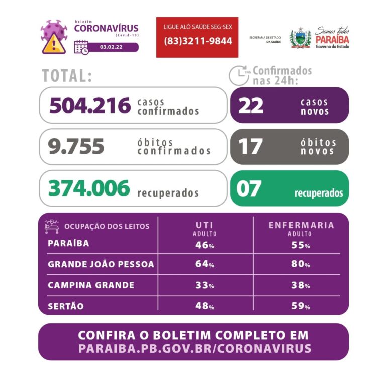 A Paraíba tem 504.216 casos confirmados de contaminação pelo novo coronavírus, segundo informações da Secretaria de Estado da Saúde (SES), divulgadas nesta quinta-feira (3). O número de mortes confirmadas por Covid-19 é de 9.755 no estado desde o início da pandemia. São 22 novos casos na última atualização e 17 óbitos confirmados.