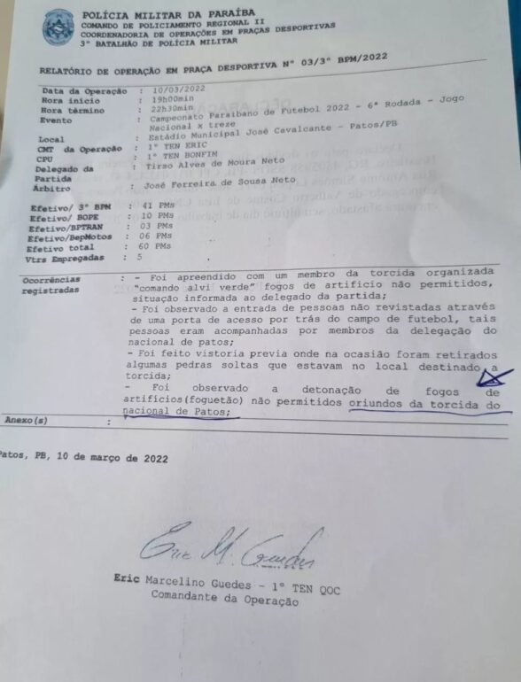 Quem registrou o fato foi a Polícia Militar, que em seu relatório sobre o que ocorreu na partida entre Nacional de Patos e CSP, no dia 16 de fevereiro, descreveu que um torcedor havia entrado na praça esportiva com o artefato. Além disso, a PM relatou que fogos de artifício foram detonados na arquibancada, o que também não pode.