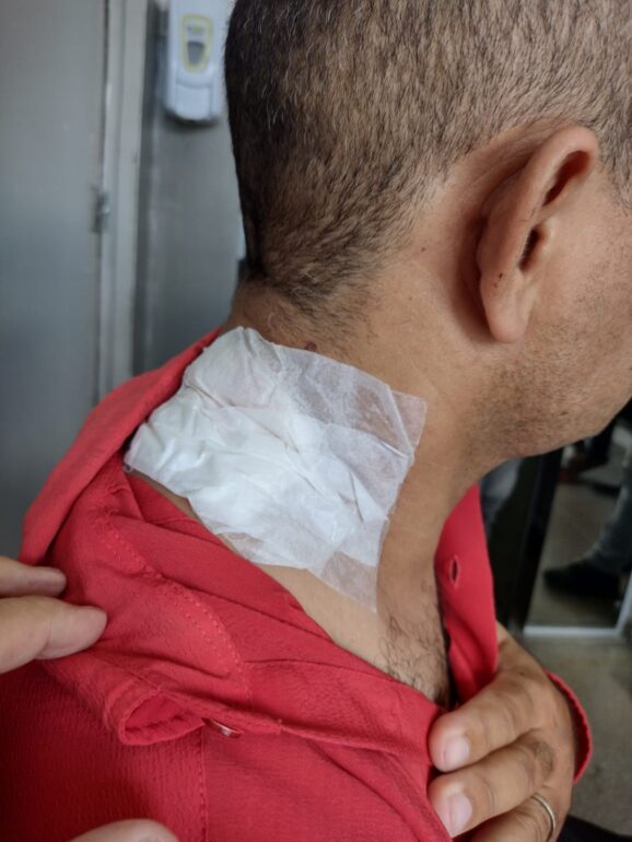 A bala que atingiu o pescoço está alojada no ombro da vítima.