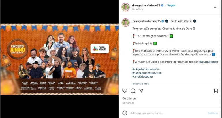 Em suas redes sociais, o prefeito Augusto Valadares divulgou uma programação estendida para os festejos de São João. Serão “mais de 20 atrações nacionais” no Circuito Junino de Ouro Velho com entrada grátis, conforme enfatizou o gestor. Ele ainda explicou que será montada a “Arena Ouro Velho” com piso especial, barracas, praça de alimentação e segurança para o público.