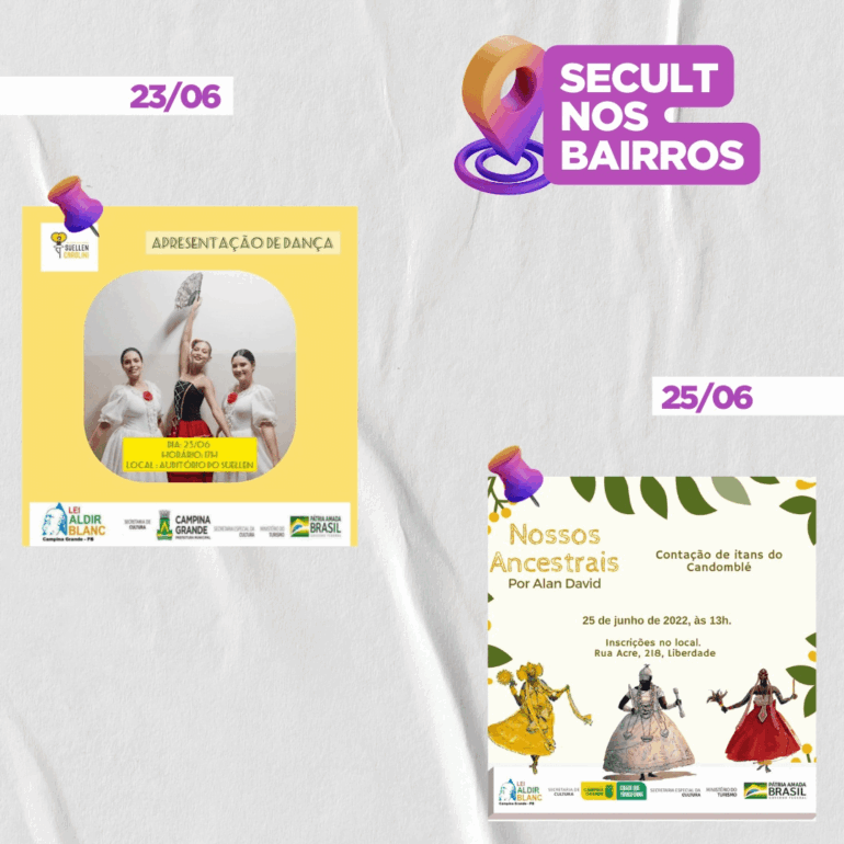 O projeto Secult nos Bairros está em mais um período de plena programação. No início desta semana, contando a partir do dia 20 de junho, foram contemplados os bairros: Catolé, São José e Monte Castelo com oficinas e ações formativas. Contudo, nos próximos dias 22, 23 e 25, Bodocongó, Galante, Sandra Cavalcante e Liberdade serão as localidades atendidas.