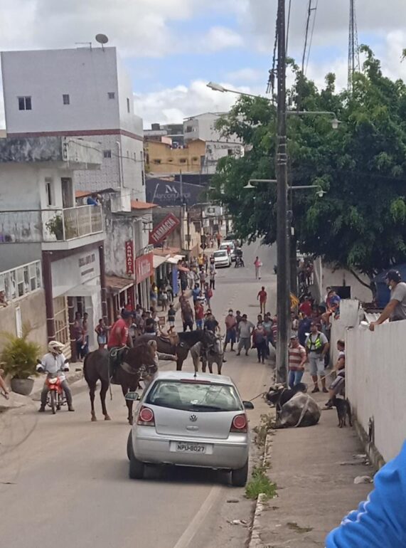 Em cima de um cavalo, o responsável foi flagrado guiado o boi em alta velocidade.