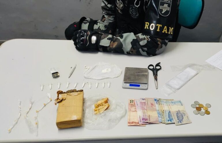 Na residência, policiais da Rotam apreenderam 1 tablete de maconha, cigarros, 10 pinos de cocaína e 13 pedras de crack.