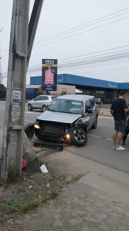 Nas imagens, é possível confirmar a força da colisão, já que o carro acabou partindo o poste de energia elétrica ao meio.