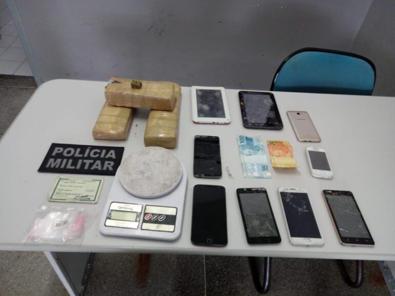 Durante as buscas, os policiais encontraram e apreenderam 2,5 quilos de uma substância análoga a maconha, 120 reais em dinheiro; uma balança de precisão, um saco plástico de embalagem, seis celulares e dois tablets. Todo o material foi encontrado em uma mochila.