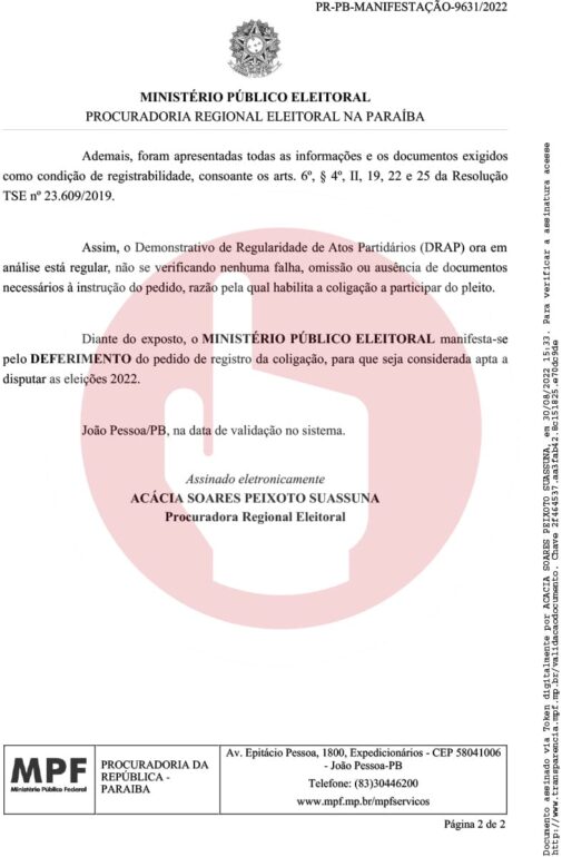 “O Ministério Público Eleitoral manifesta-se pelo deferimento do pedido de registro da coligação A PARAÍBA TEM PRESSA DE SER FELIZ, integrada pelo partido MDB e pela Federação Brasil da Esperança (PT/PC do B/PV), para que seja considerada apta a disputar as eleições 2022″, ressaltou a procuradora no documento.
