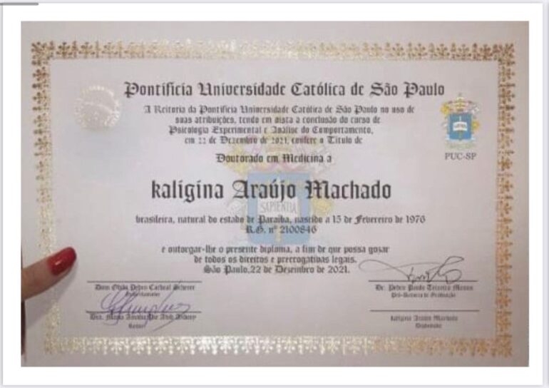 As provas mostram ainda que Kaligina Araújo Machado se apresentava em entrevistas, eventos e nas redes sociais como psicóloga, doutora em Psicologia Experimental e Análise do Comportamento pela PUC de São Paulo. Ele se intitulava com outras formações internacionais como mestrado pela Must University Flórida e psiquiatria em saúde mental da infância e adolescência pela pela CBI of Miame, ambas instituições nos Estados Unidos, sendo que nenhuma das formações foram confirmadas como autênticas.