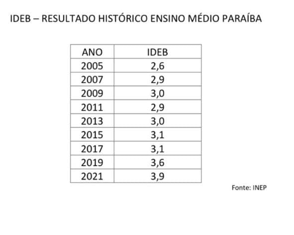 Na comparação com outras gestões, João Azevêdo ampliou de 3,1 para 3,9, perfazendo numa evolução de 0,8, contra os 0,5 somados das gestões de Cássio, Maranhão e Ricardo, conforme dados obtidos junto ao Ministério da Educação, que seguem detalhados logo abaixo.