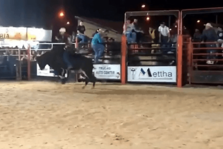 Durante a ocorrência, antes de cair desacordado na arena, o peão foi atingido pelo touro e perdeu o capacete que usava como proteção.