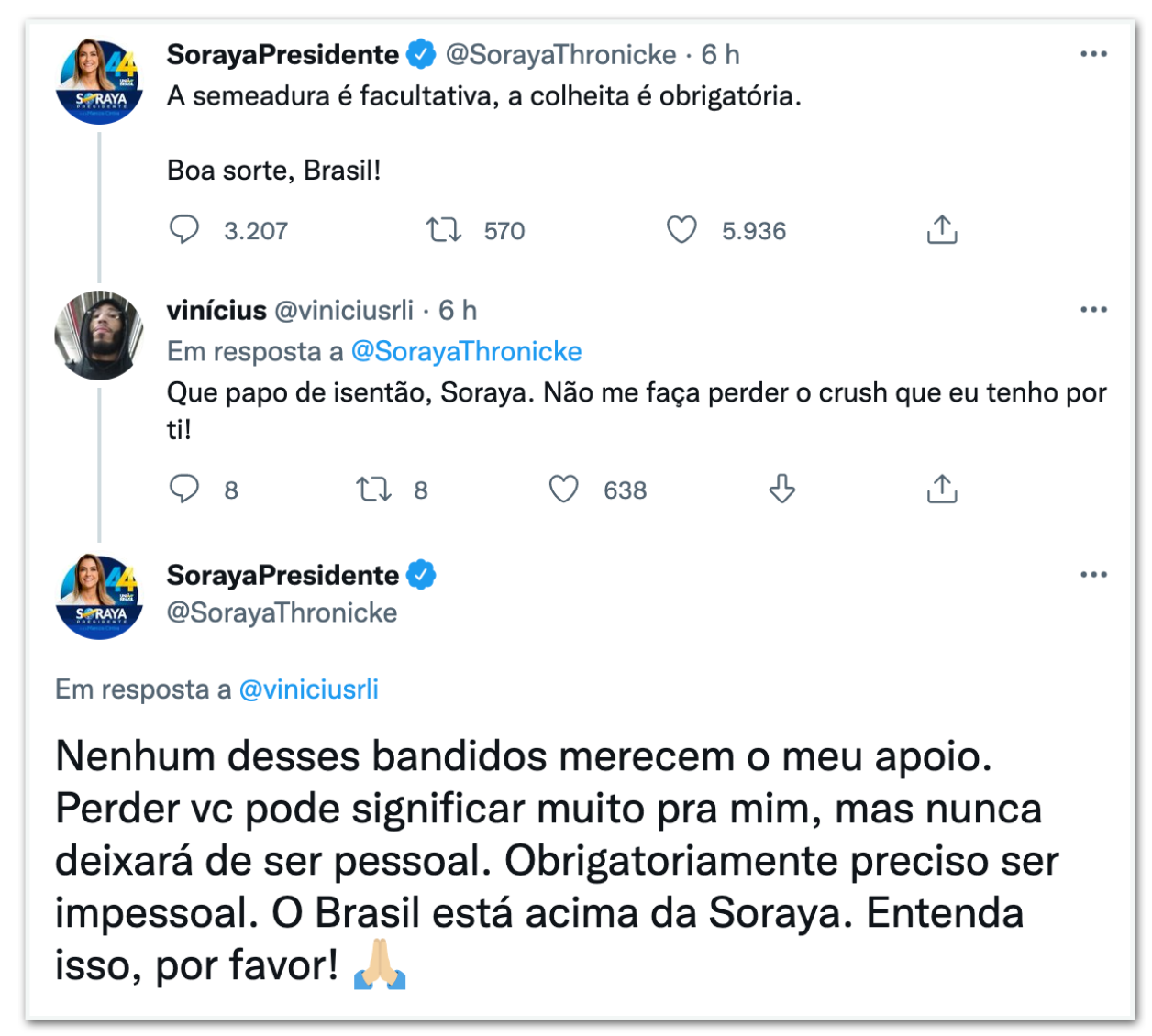 “Perder você pode significar muito para mim, mas nunca deixará de ser pessoal. Obrigatoriamente preciso ser impessoal. O Brasil está acima da Soraya. Entenda isso, por favor”, disse Soraya.