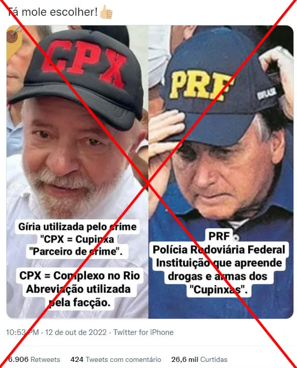 Circula nas redes sociais a informação de que um boné com a abreviação “CPX”, usado pelo ex-presidente e candidato à presidência Lula (PT) durante evento de campanha no Complexo do Alemão, na quarta-feira (12), é uma referência a uma facção criminosa que domina o tráfico de drogas na região. É #FAKE.