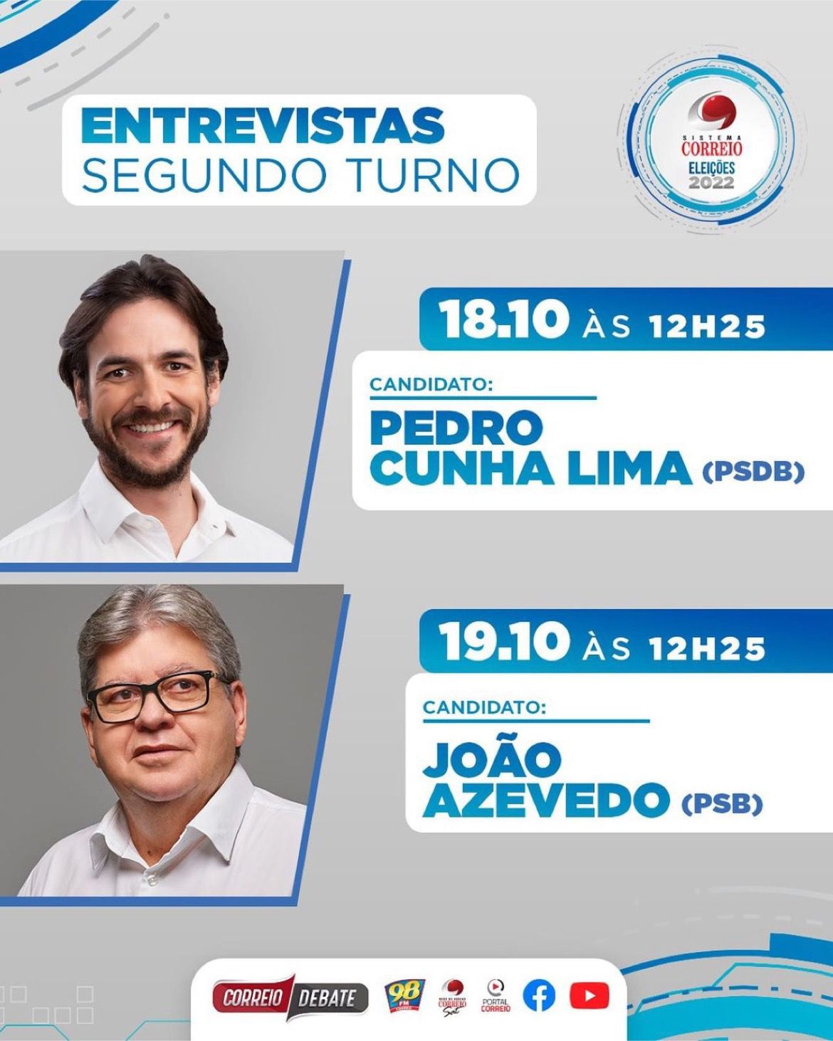 Pedro Cunha Lima (PSDB) será o entrevistado desta manhã, já João Azevêdo (PSB) está agendado para amanhã.