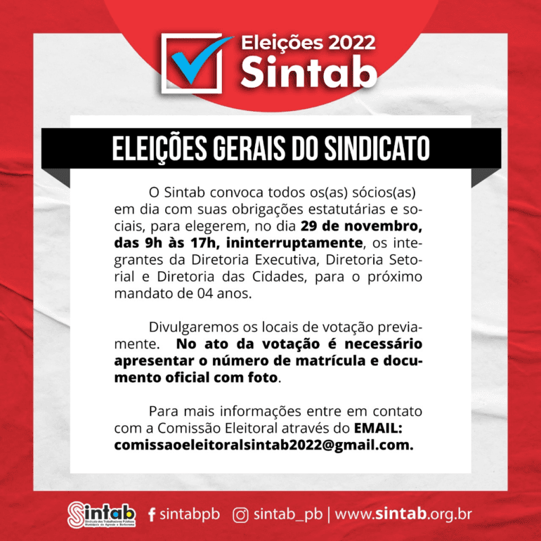 O edital pode ser acessado através do link: https://sintab.org.br/wp-content/uploads/2022/09/Edital-Eleicao-2022-2.pdf