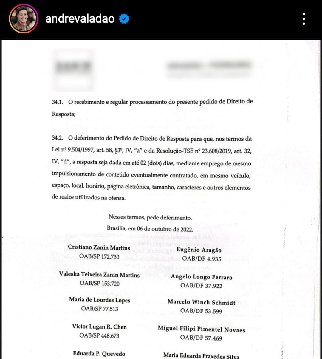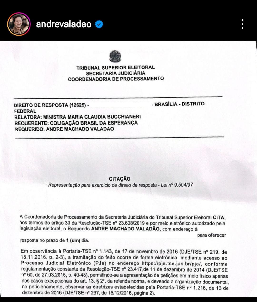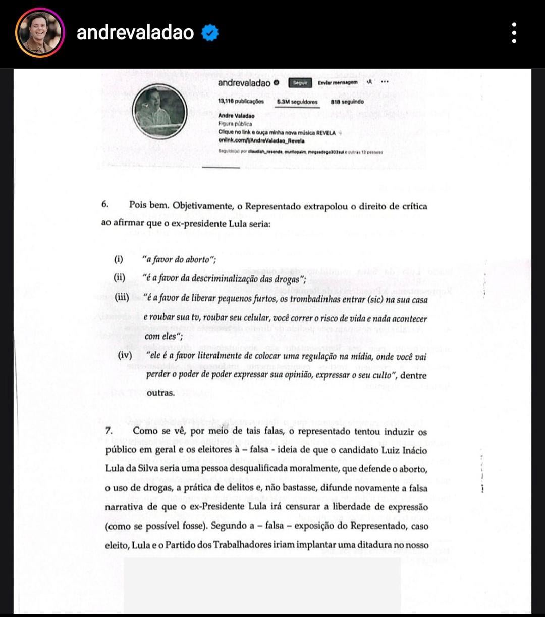 “Recebi citação do TSE para que me manifestasse, no prazo de 1 (um) dia, sobre representação da Coligação do Lula, em que eles pediam que houvesse direito de resposta a um vídeo em que falei sobre a relação entre Lula e temas como aborto, descriminalização das drogas, furtos, regulação da mídia e liberdade de expressão. Desejavam que, pelo mesmo veículo (meu perfil no Instagram), eu desdissesse o que havia gravado.