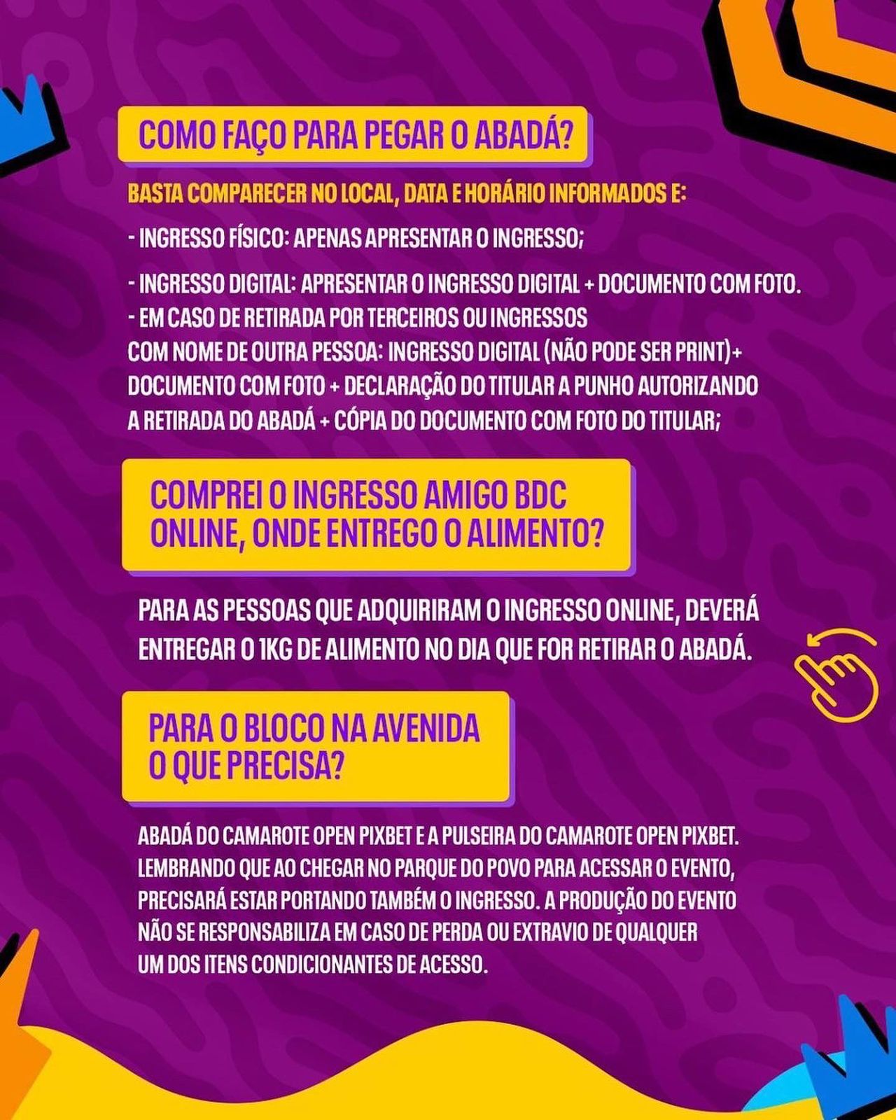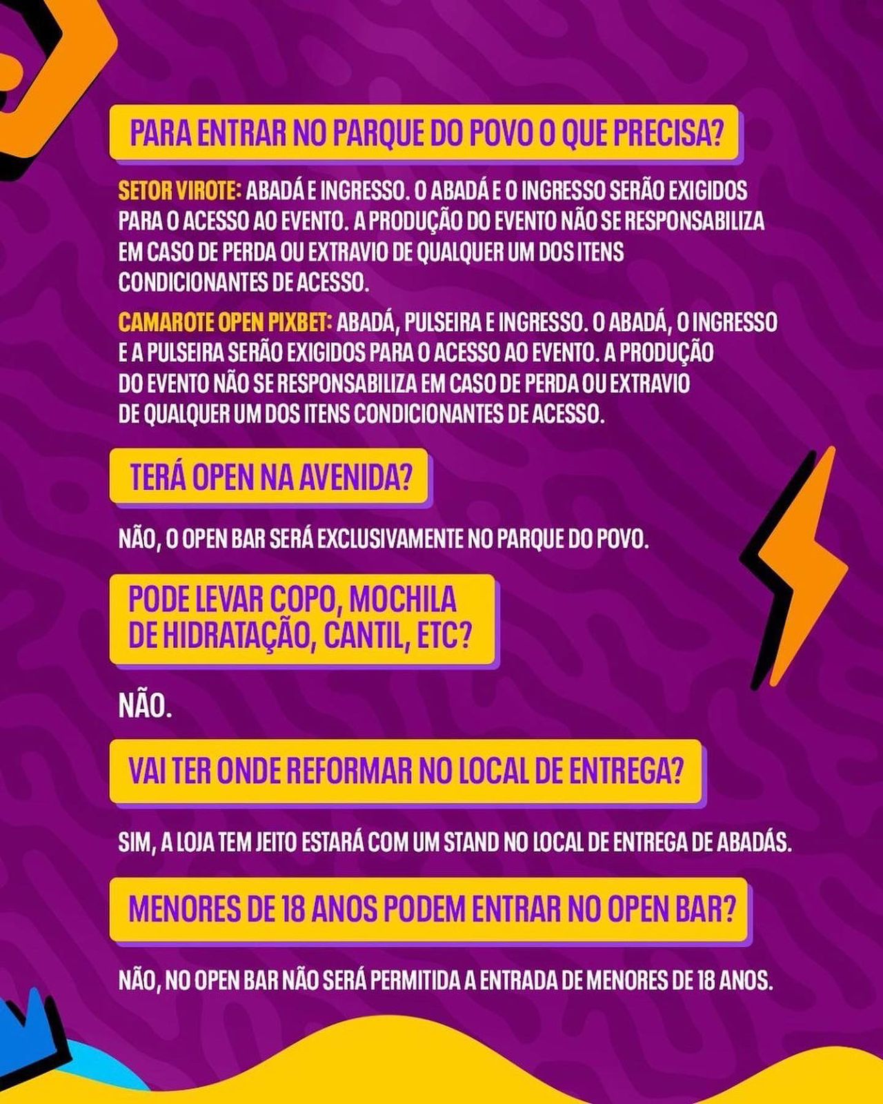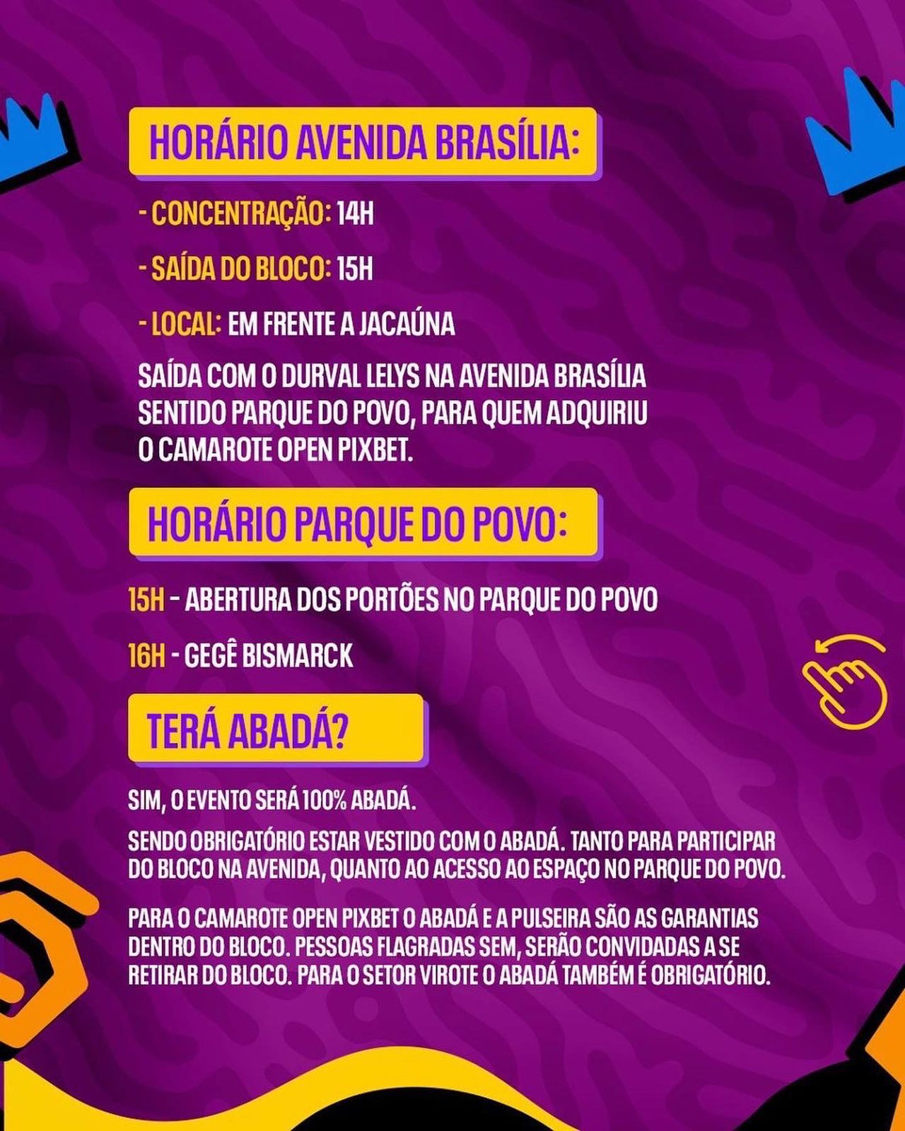 O bloco começa as 15 horas na Avenida Brasília, onde o cantor Durval Lelys vai comandar a folia e levar os foliões até o ponto central da festa, o Parque do Povo, lá se apresentarão os cantores Léo Santana, Eric Land e o dono da festa, Wesley Safadão.