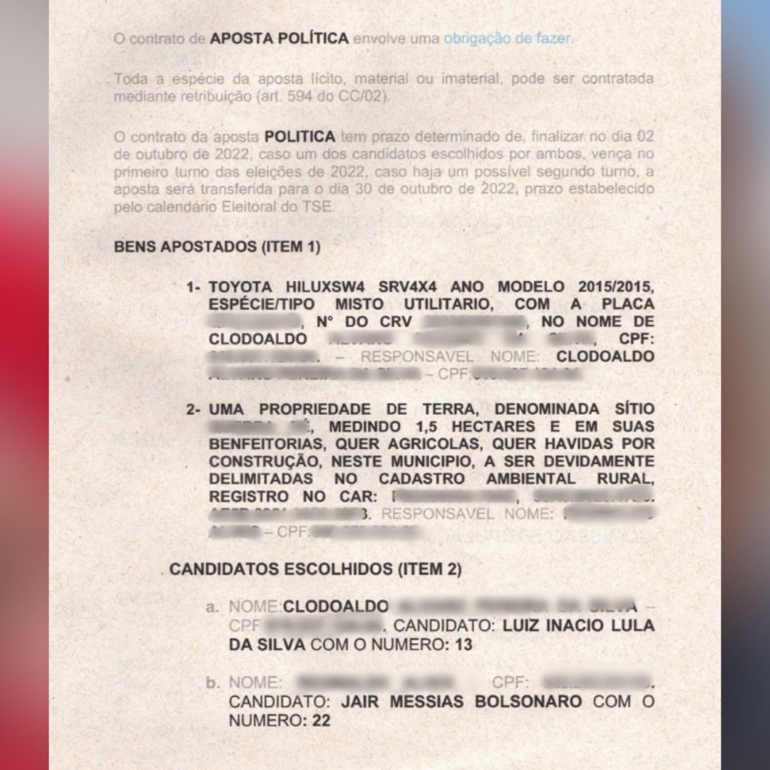 Entre as apostas documentadas, os petistas casaram uma Hillux SW4 contra um sítio; um apartamento (situado em Campina Grande) contra um prédio comercial (localizado em João Pessoa; e uma outra aposta envolvendo um terreno contra outro terreno.