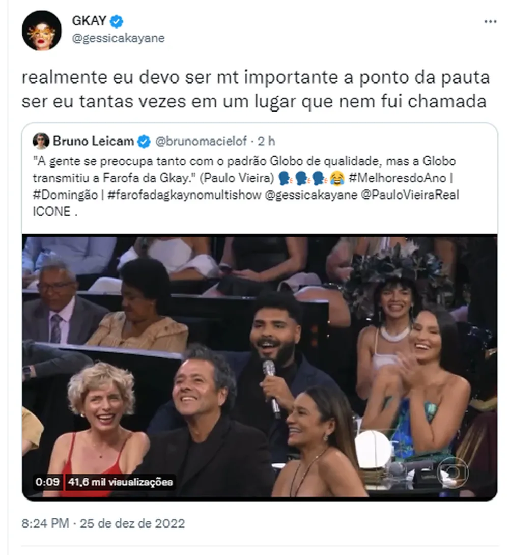 “Realmente eu devo ser muito importante a ponto da pauta ser eu tantas vezes em um lugar que nem fui chamada”, começou ela, que foi alvo de piadas dos humoristas Fábio Porchat e Paulo Vieira. Em certo momento, Porchat, logo depois de uma homenagem aos artistas mortos em 2022, se questionou “o que Jô Soares faria com uma Gkay na frente dele”. “Foi por isso que ele preferiu nos deixar”, diz Porchat a Tatá Werneck.