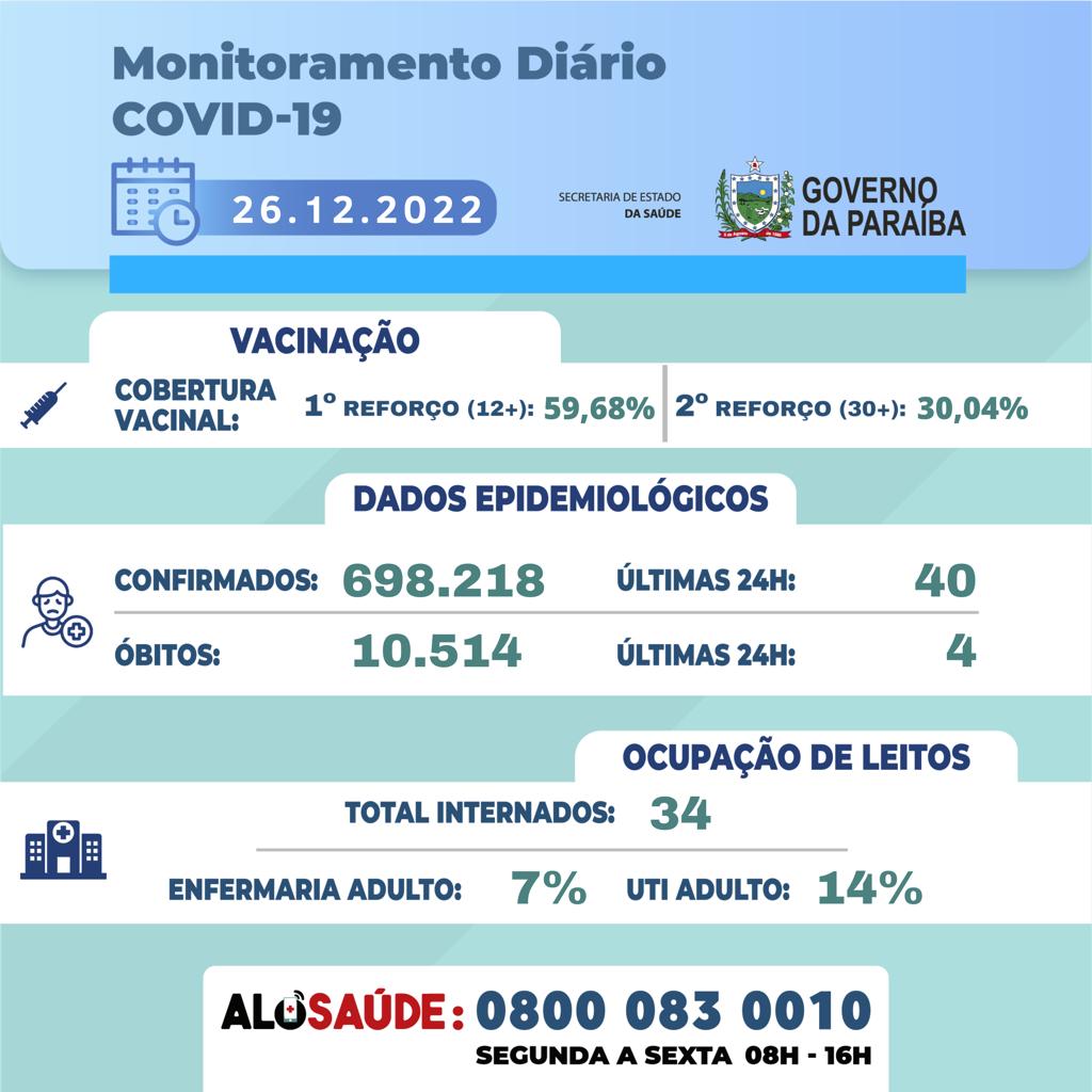 A Secretaria de Estado da Saúde (SES) registrou, nesta segunda (26), 40 casos de covid-19. Entre os casos confirmados, 3 (7,5%) são moderados ou graves e 37 (92,5%) são leves. Agora, a Paraíba totaliza 698.218 casos confirmados da doença, que estão distribuídos por todos os 223 municípios.