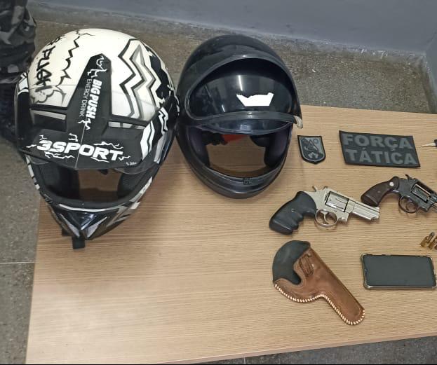 Nesta manhã, ele foi levado a delegacia de Polícia Civil. Com ele, a equipe apreendeu duas armas com munições, um celular e dois capacetes.