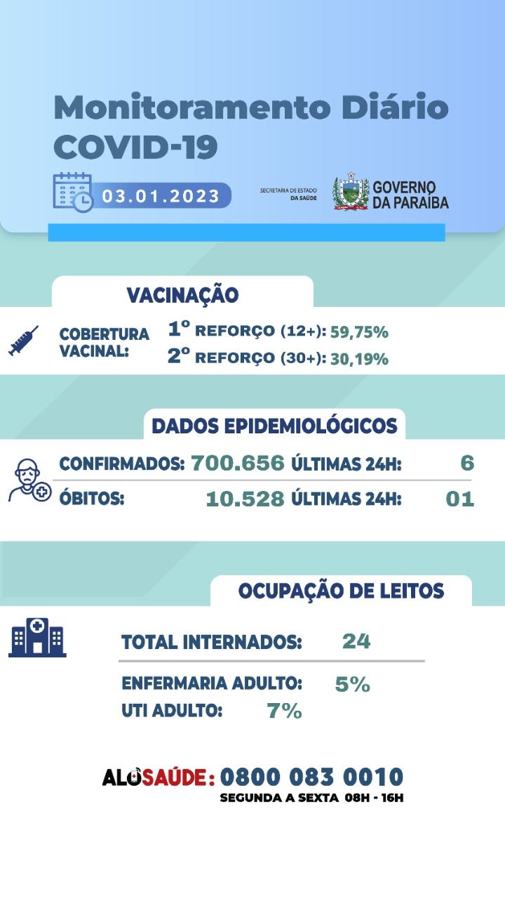A Secretaria de Estado da Saúde (SES) registrou, nesta terça (3), 06 casos de covid-19. Entre os casos confirmados neste boletim, 4 (66,67%) são moderados ou graves e 2 (33,33%) são leves. Agora, a Paraíba totaliza 700.656 casos confirmados da doença, que estão distribuídos por todos os 223 municípios.