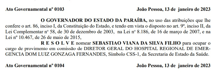 O governador da Paraíba nomeou o médico Sebastião Viana da Silva Filho, como diretor geral do Hospital de Trauma de Campina Grande, na Paraíba. A nomeação foi publicada no Diário Oficial desta sexta-feira (13). O médico-cirurgião ocupava o cargo de diretor técnico do Trauma-CG.