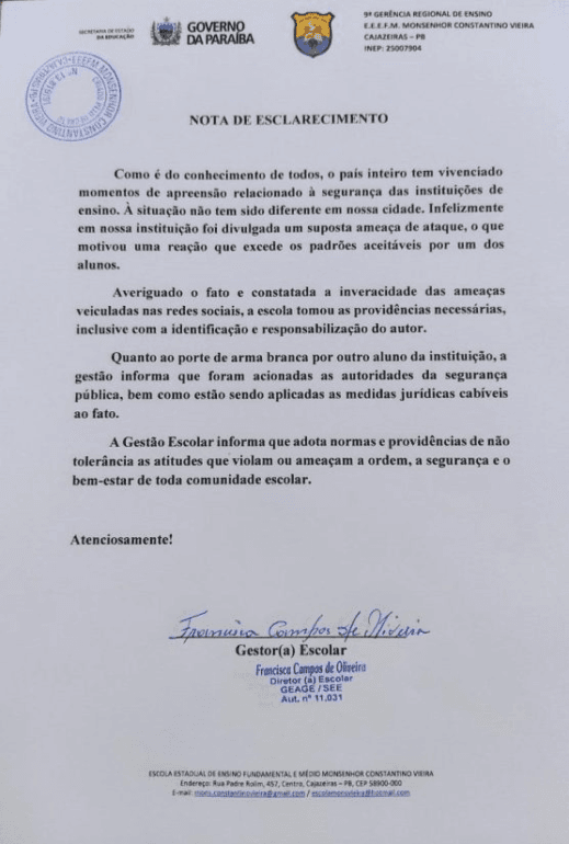 Na nota ela diz que as divulgações das supostas ameaças teriam sido veiculadas em redes sociais, no entanto, a instituição já tomou as medidas necessárias e inclusive já tem a identificação do autor, o qual segundo a nota, será responsabilizado.