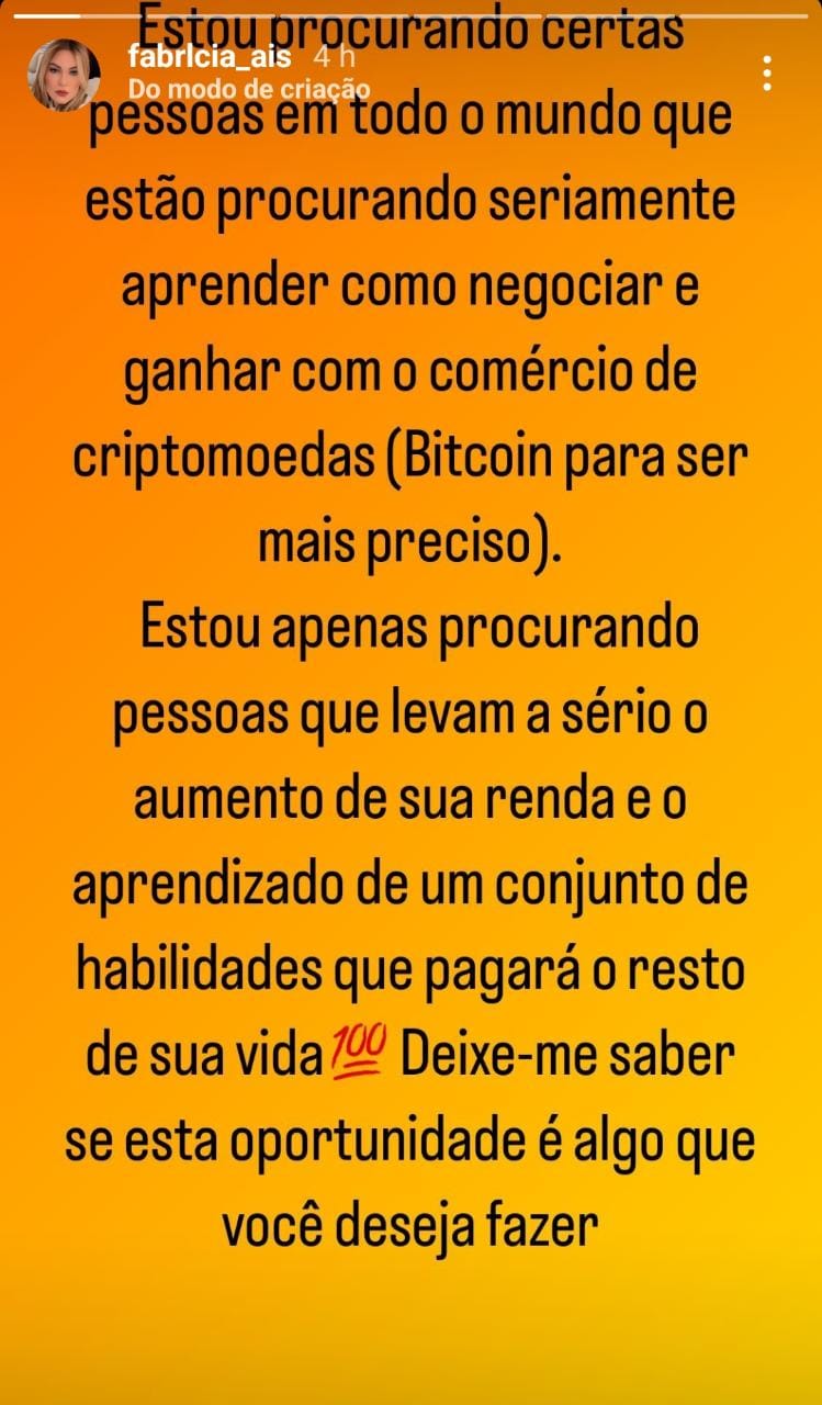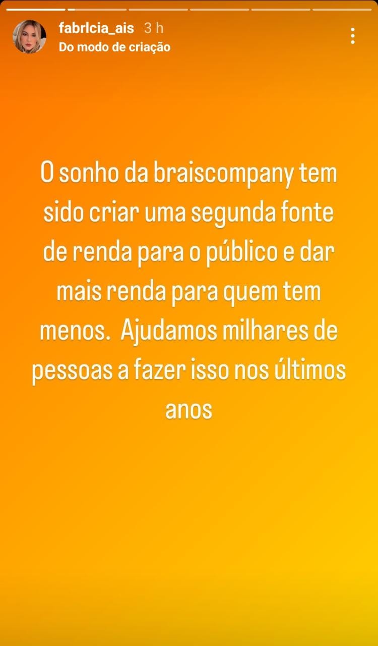 “O sonho da Braiscompany tem sido criar uma segunda fonte de renda para o público e dar mais renda para quem tem menos. Ajudamos milhares de pessoas a fazer isso nos últimos anos. Todos os nossos esforços e dedicação foram em prol deste modelo de negócios”, traz o perfil atribuído a Fabrícia em outra publicação.