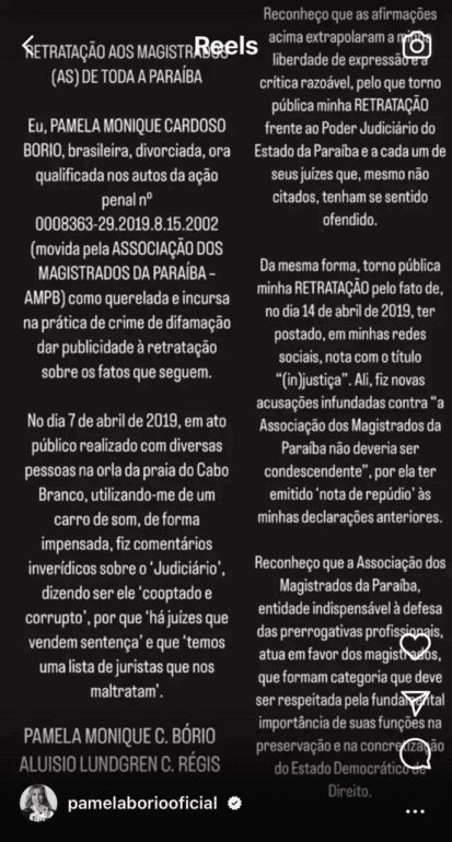 A ex-primeira-dama da Paraíba Pâmela Bório publicou uma retratação, nesta terça-feira (23), pela acusação feita em 2019 contra o judiciário paraibano. Durante um ato em apoio ao ex-presidente Jair Bolsonaro (PL), Pâmela acusou magistrados de “venderem sentenças” e chegou a nominar o juiz Aluízio Bezerra. Pâmela restringiu a retratação ao reels do Instagram, diminuindo o alcance da publicação.