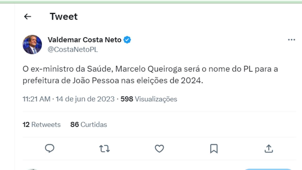 Na ocasião, o dono do PL, Valdemar Costa Neto, lançou Queiroga como candidato à prefeitura de João Pessoa pelo partido nas eleições de 2024.