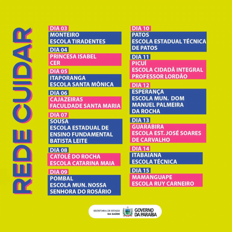A Caravana esteve hoje (4) em Princesa Isabel; dia 5 em ltaporanga; dia 6 em Cajazeiras; dia 7 em Sousa; dia 8 em Catolé do Rocha; dia 9 em Pombal; dia 10 em Patos; dia 11 em Picuí; dia 12 em Esperança; dia 13 em Guarabira; dia 14 em Itabaiana e dia 15 em Mamanguape.