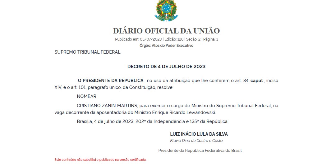 O advogado Cristiano Zanin foi oficialmente nomeado ministro do Supremo Tribunal Federal (STF) nesta quarta-feira (5). A nomeação para o cargo foi publicada em edição do Diário Oficial da União.