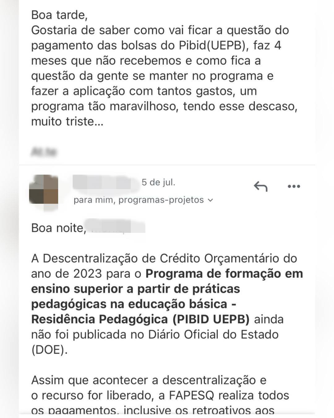 Uma estudante do curso de Educação Física da Universidade Estadual da Paraíba (UEPB) procurou o Blog para relatar um atraso no pagamento da bolsa PIBID, que é ofertada pela universidade e que deve ser paga pela Fundação de Apoio à Pesquisa do Estado da Paraíba (FAPESQ).