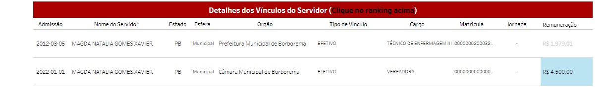 De acordo com documento do MP, a vereadora é investigada por ocupar dois cargos públicos. Magda Natália é do quadro efetivo da Prefeitura de Borborema nomeada como técnica de enfermagem. Na época dos fatos, ela também exerceu o cargo de presidente da câmara de vereadores recebendo pelas duas funções.
