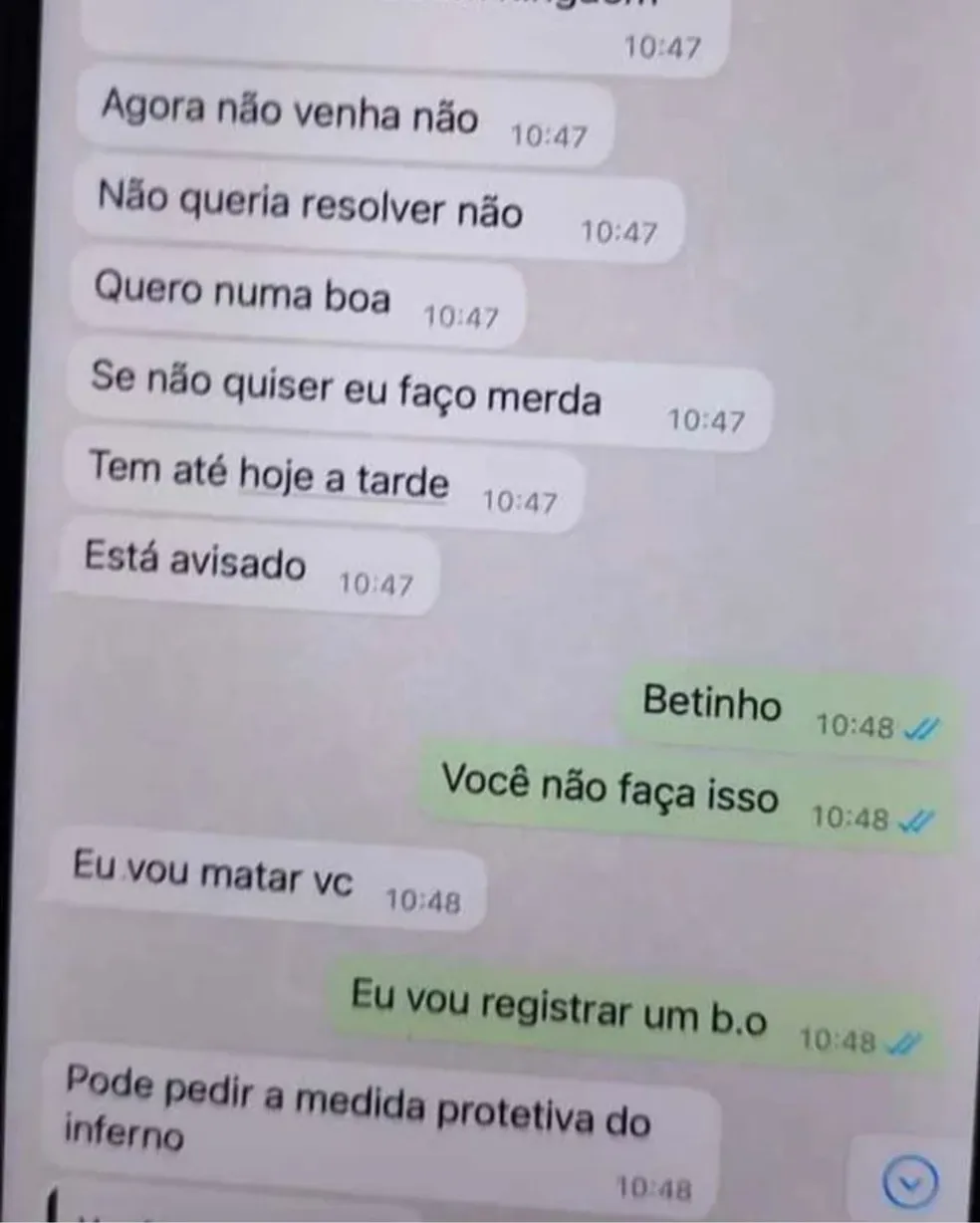 Um dos prints da conversa mostra Betinho Barros dizendo que a vítima, a estudante Rayssa de Sá, de 19 anos, vai se arrepender de algo. Ele ameaça matá-la, e ela responde que vai registrar um boletim de ocorrência. Em seguida, ele debocha: “pode pedir a medida protetiva do inferno”.