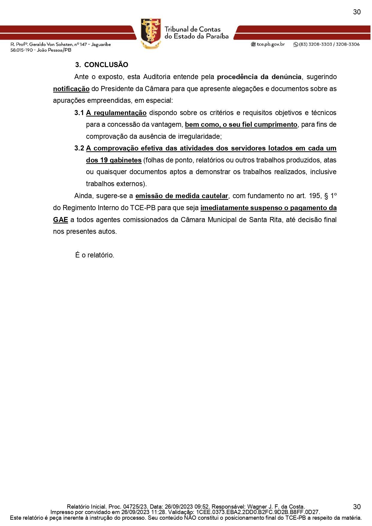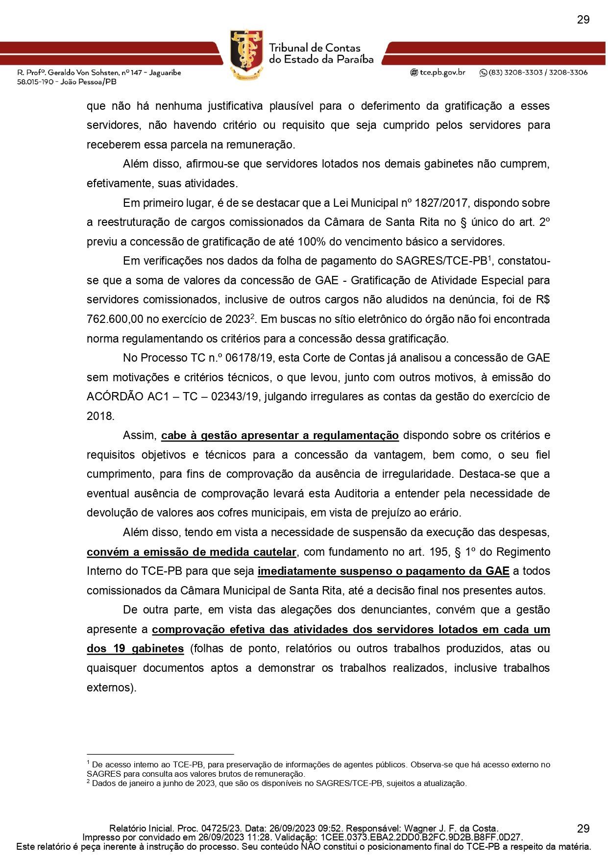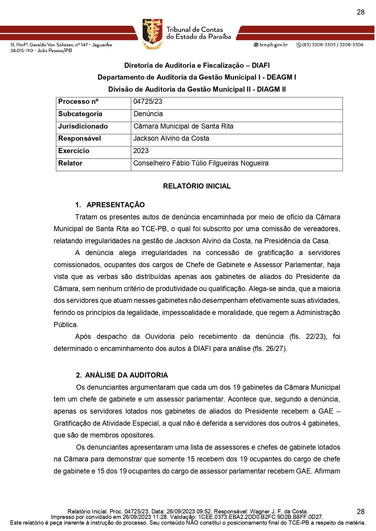 A auditoria do TCE-PB emitiu parecer no qual considera legítima a denúncia, “sugerindo notificação do Presidente da Câmara para que apresente alegações e documentos sobre as apurações empreendidas”. A auditoria quer comprovação da “regulamentação dispondo sobre os critérios e requisitos objetivos e técnicos para a concessão da vantagem, bem como, o seu fiel cumprimento, para fins de comprovação da ausência de irregularidade” e “a comprovação efetiva das atividades dos servidores lotados em cada um dos 19 gabinetes (folhas de ponto, relatórios ou outros trabalhos produzidos, atas ou quaisquer documentos aptos a demonstrar os trabalhos realizados, inclusive trabalhos externos).”